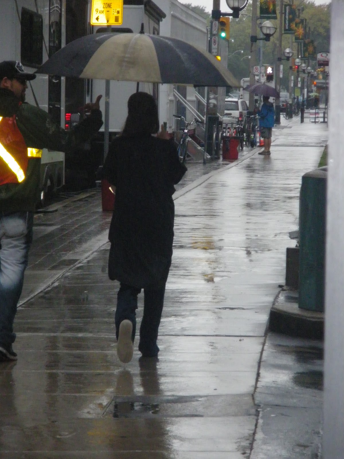 Kevin and Robert walked back and forth between the Pandemonium Set and their trailers, each time smiling at us, or waving and a few times stopping to give us yet another hug. Then Ashley spotted Jemima “Isabelle” West walking up the street under an umbrella. The rain was coming down on and off, so we were huddled under umbrella’s to get the view of the sidewalk. She smiled at us, but went to her trailer. I was determined to get her autograph. She came and left, one time even walking back with Kevin. They were so cute! Brother and sister like! Then she took a break and signed our books! I think she was nervous because she put a hole in mine and Ashley’s book title page. But we didn’t care! It was Jemima! I asked her “are you on twitter?” and she said “I don’t do well on social sites, no.” There you have it!