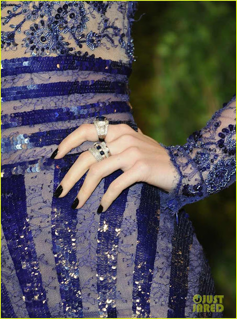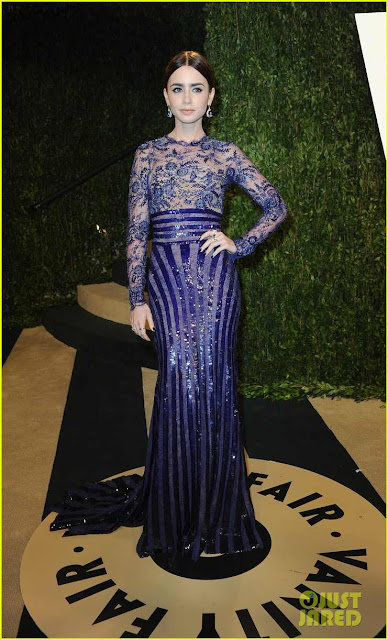 Mortal Instruments star Lily Collins dazzles in a Zuhair Murad dress and Takat earrings as she enters the Vanity Fair Oscar party tonight.