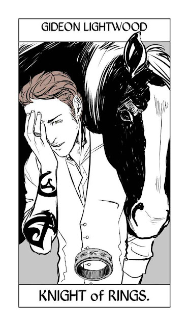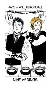 I wonder what loss the Blackthorn family is suffering from. I guess we will have to wait until March 2015 when the first novel of the series is released!So Cassandra Jean has finished the complete Shadowhunter Tarot, so for the next … seventy-something days I’ll be posting a card a day (okay, maybe not every day — I tend to get distracted!) in order, from the first card to the last. Some will be under spoiler cuts; some you’ll have seen before — I’ll explain why each character has the card they have.We’ve moved on from the Major Arcana to the minor Arcana — the first suit is the suit of Rings, which takes the place of the suit of Pentacles. The Five of Rings is the Blackthorn ring. It shows the Blackthorn family, TDA-era, in all their glory. Tiberius looking crabby as usual, Julian messing around, Mark being serious.The Five of Pentacles (Rings here) can often represent going forward after suffering a loss.